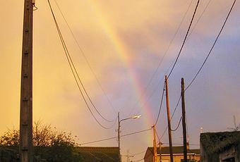 El arcoiris sale al atardecer entre los cables del tendido de un pueblo de Toledo, España