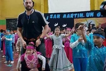 Mariano Salas es el docente de Educación Física de Agostina en el Colegio del Carmen de Catamarca. Junto a sus compañeros de segundo grado eran los encargados del acto para conmemorar a San Martín. El profesor alguna vez había visto por Internet que existen sistemas para llevar a los chicos que no pueden caminar parados junto a un adulto que los ayude y se propuso crear uno para que su alumna baile con sus amigos.