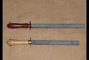 Habitualmente, los que afilamos nuestros propios cuchillos, lo hacemos con piedras comerciales rectangulares o piedras lisas de rio. Hoy quiero mostraros las piedras con las que afilo mis cuchillos de corte de jamón. Son de piedra natural, pero no las típicas rectangulares, yo las uso cilíndricas. Gracias a su forma, similar a las chairas de acero, facilita mucho su uso. Dependiendo del grano de la piedra, se utiliza para una determinada función del afilado, yo uso tres: grano 700 para vaciar, 1200 para afinar y 6000 para pulir. La forma de uso, aunque requiere algo de práctica, no es demasiado complicada, se efectúa de forma similar a como lo haríamos con la chaira de acero. Es fundamental mojar con agua las piedras. Juan Carlos Gómez Sierra.