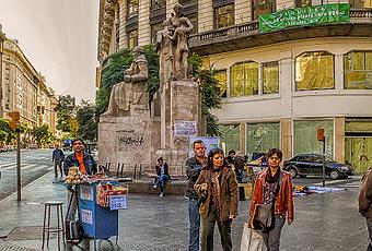 La imagen muestra gente paseando por el microcentro porteño, justo en la intersección de la Peatonal Florida y la Avda. Diagonal Norte como se le conoce a la Avda. Roque Saenz Peña.