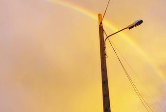 Un precioso y enorme arcoíris sale tras la lluvía en un pueblo de Toledo, por detrás de la farola que en breve comenzará a lucir... Los colores dejarán paso a la oscuridad y a la luz tan sólo blanca