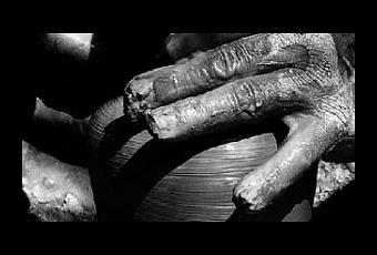 Nuestro protagonista, el hombre sereno, etcétera, es alfarero. Amasa el barro sobre un torno eléctrico, que gira y gira. Hace botijos, cántaros, cuencos, orzas, lebrillos y jarras para el vino. Usa una media caña para alisar las piezas y se fija mucho en lo que hace, acercándose.