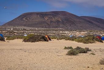 Aquí no hay "rulots", autocaravanas ni bungalows. Las tiendas de campaña son tan pequeñas que apenas se distinguen de los matorrales. Al fondo la montaña de Las Agujas, la más alta de la isla con 266 metros.
