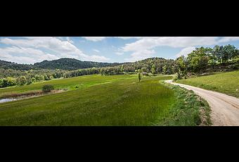Una panorámica de dos fotos con la balsa del Graell y al fondo el Collet del Migdia. Los pinos lucirían más verdes de no ser por la procesionaria, que los ha matado.