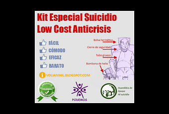 Cuando saqué a la venta Au Revoir "Pack definitivo para el suicidio" y el Kit Especial Suicidio Low Cost Anticrisis sabía que iban a tener muy buena acogida. Las visitas al blog se han incrementado considerablemente gracias a las búsquedas en google de formas rápidas e indoloras de suicidarse. He recibido muchos correos amenazantes, sí, pero sobretodo peticiones de presupuesto o directamente encargos sin importar el precio. "Mándamelo ya", "por correo urgente", "pago lo que sea". Después de una supuesta legalización de la marihuana y la prostitución, no se me ocurre otra fórmula de negocio más lucrativo y efectivo para incrementar las arcas del estado vía impuestos, además de ser una industria eminentemente productiva con un target cada vez más amplio.
