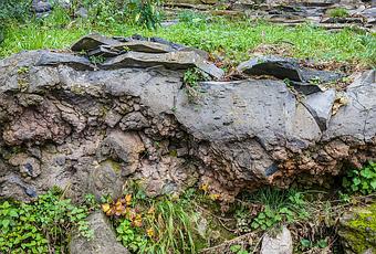 El interior de un blister, relleno de basalto y sedimentos. Estos blisters son los únicos de la Península Ibérica y prácticamente también de todo el continente europeo. Sólo se han encontrado blisters similares en Lanzarote, Irlanda y Hawaii.