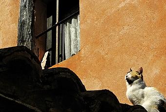 Un gato subido al tejado de una casa se pone al calorcito del sol en un frío día en Albarracín, Teruel, España.