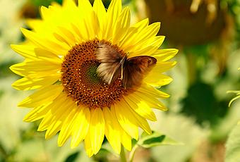 Una mariposa que posada sobre un girasol, parece que se transforma