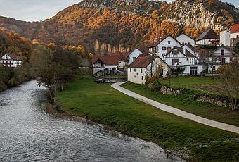 Vista del pequeño pueblo de Aribe (62 habitantes) desde lo alto del puente medieval sobre el río Irati. Una imagen de postal.