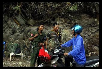 Fotografía facilitada el domingo 13 de mayo de 2012, que muestra a un soldado birmano (izda) y un soldado del Ejército Budista Karen Democrático (DKBA) (centro), inspeccionan a un motorista en la carretera Kawkareik-Myawaddy en Myawaddy (Birmania) el 9 de mayo de 2012.
