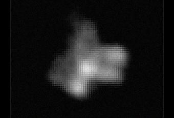 El Meteor-1 captado a 425km de altura el 2 de junio de 2011. A la izquierda se representa una imagen del original. El conjunto de dos paneles solares se encontraba aún desplegado en esa fecha.