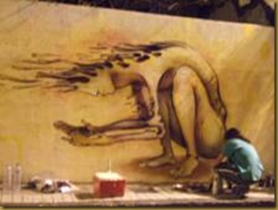 Entre sueños y desvelos, los colores dispersos en el aire, figuras rondando en la cabeza, las paredes cual inmensos lienzos en blanco le guiñan el ojo coquetamente, no hay vuelta atrás, si toma la mano y toma el pincel tendrá que ser parte de su inconsciente, sabe que los colores le irán diciendo uno a uno como quieren ser puestos, las figuras aparecen en el aire como plantillas puntilladas, este es un hermoso sueño piensa, ahora soy yo quien se transforma en pincel y se deja llevar por la mano que sabe adonde se dirige cada trazo.