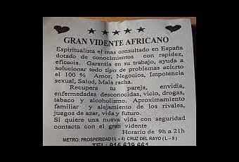 a la sensación que quién va cargada/o de energía negativa por la vida eres tú por lo que lo único que irradias es eso negatividad y es cuestión de tiempo, no mucho generalmente, que una vez que comienzan a suceder las malas cosas se produzca el temido efecto dominó y todo comience a caerse, a romperse o lo que sea que tenga que suceder para joderte un poco más tú ya de por sí jodida vida.Hay que estar muy desesperado como para no ver otra salida a tus problemas que el acudir a que te pasen un montón de hierbajos por los hombros para limpiarte el aura, igual es mejor aunque sea más complicado, intentar sacar toda la negatividad contenida dentro intentando vislumbrar la parte positiva de la situación que vives, aunque sea complicado seguro que existe, porque todo tiene su parte positiva y es aquí cuando hay que sentarse a pensar, a vislumbrar un futuro un poco mejor para que las cosas se vayan enderezando solas pero no sirve tumbarse en el sofá a la espera, hay que ponerse en acción, coger las riendas de tu vida y encaminarla hacía donde quieres ir.Pero llega un momento en el que ya estás cansado de hablar con técnicos que van reparando tu vida por dentro y por fuera, de soltar pasta a diestro y siniestro para que ordenen tu caótica existencia, es entonces cuando abres el buzón y te encuentras con un panfleto del “Profesor Lamin” o cualquier otro “Gran vidente africano” que te asegura resolver todos tus problemas ya sean de amor, de retorno de seres queridos, de problemas de pareja, de obtener algo de suerte en la vida y en el trabajo o en los exámenes, de atracción de clientela, de impotencia sexual o de protección contra peligros y complejos psíquicos y morales y además de solucionarte todo te da un 100% de garantías de eficacia en tan sólo 7 días.