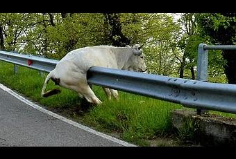 Roberto Marano, circulaba con su coche, por una carretera de Montecorvino Rovella en Salerno (Italia), cuando se encontró con esta vaca, que se había quedado, literalmente, colgada de una valla de la carretera, en su intento de cruzar hacia el otro lado de la carretera y que como es un gran aficionado a la fotografía, inmortalizó el instante.