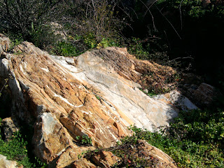Las coordenadas de mi tío habían sido acertadas y, tras caminar otro trecho más, hubimos de desviarnos del camino para adentrarnos por las asperezas de un cerro en cuya bajada y como resguardado providencialmente por un árbol enano de tronco negro (sin duda, sembrado en la travesura de los trasgos, para despistar a los caminantes), nos salió al encuentro la piedra resbaliza como tierra de promisión.