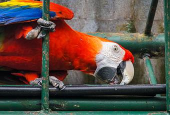 Me da a mí que este ejemplar de guacamaya roja (Ara macao) está destrozando un tubo de plástico de la parte alta del mariposario. Pronto va a haber que llamar al técnico.