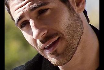 Su look es rockero y muy sexy, desde una barba de dos días y medio y una “chupa” de cuero negra como sus bucles y su mirada…
