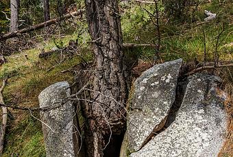 No sé si el pino partió la roca o bien ésta ya estaba rota cuando nació el árbol.