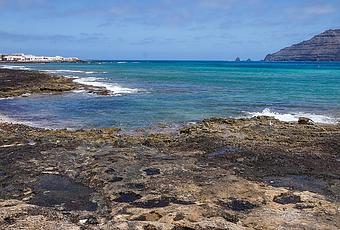 El "Río", la estrecha franja de mar que separa La Graciosa de Lanzarote. Al fondo Los Fariones.