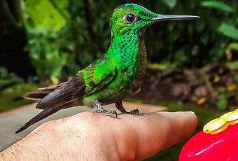 Los colibrís agradecen que acerques la mano a los comederos. Así pueden dejar de batir las alas mientras comen. Aquí un colibrí brillante coroniverde (Heliodoxa jacula) posado en mi mano mientras con la otra le hago esta foto con el móvil. Es una sensación curiosa el sentir su poco peso sobre la mano.
