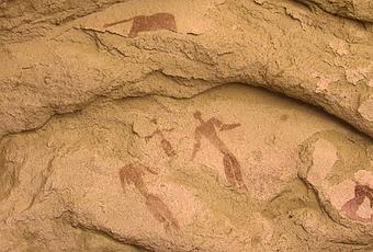 En la parte superior está un león sin cabeza, una bestia mítica que aparece en varios dibujos del arte rupestre de la misma área, mientras que abajo en la escena puede verse un babuino o un mono antropomorfo.