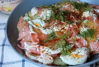 - Cortamos en rodajas las patatas y los huevos y las repartimos en un plato, rompemos también el salmón y lo repartimos también