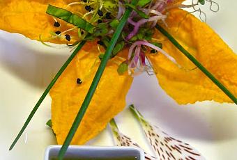 1 Flor de Calabacín1 Unos brotes tiernos, en este caso los puse de cebolla y rábano. (pero es algo que va a gustos, así que cada uno escoja los que más le gusten)1 Unas hojas de Albahaca1 Cebollino