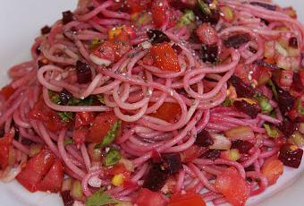 150gr. de espaguettis integrales 2 tomates de pera 2 pimientos verdes (en Mallorca utilizaríamos los pimientos blancos típicos del trampó) 1/2 lata de maíz dulce 1 cebolla dulce 1 remolacha cocida Sal marina Pimienta negra recién molida Semillas de sésamo y semillas de chía Hojas de albahaca fresca Aceite de oliva VE