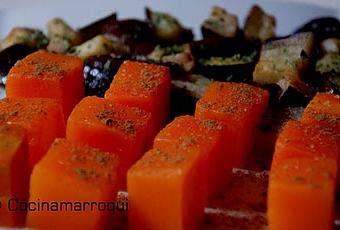 Cortamos las berenjenas también a tacos regulares, asamos a fuego lento en aceite de oliva, desengrasamos bien y reservamos.