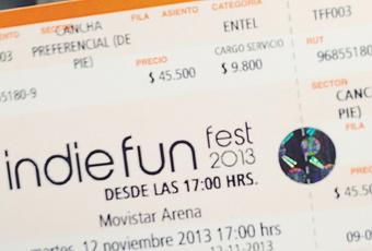 Hoy, luego de mi única clase del día y antes del test de actualidad, fui a comprar mi entrada para el Indie Fun Fest, mi localidad: cancha preferencial. Llegué justo a las 12 (del mediodía), hora en que comenzaba la primera pre-venta, al Ripley Crillón, y al subir me encontré con que ya había gente esperando, aunque no era tanta. La entrada me salió 55 mil 300 pesos, y usé el descuento de Club Entel (30% a las primeras tres mil). Puedes ver más información del evento (precios, descuentos, localidades, etcétera) en POTQ.cl.