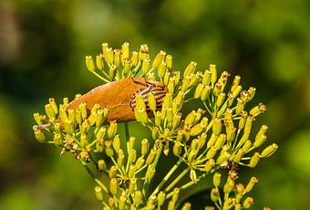 O surfeando el hinojo. La manera en que este Graphosoma lineatum estaba agarrado a esa hoja sobre un capítulo de flores de hinojo me sugería a un surfista esperando la ola deseada.