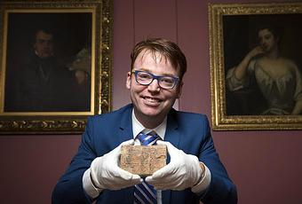 El profesor Daniel Mansfield enseña la tablilla Plimpton 322, que se conserva en la Biblioteca de Manuscritos y Libros Raros de la Universidad de Columbia, en Nueva York. Crédito: UNSW/Andrew Kelly