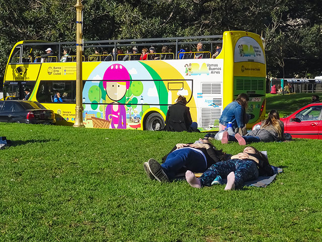 El picnic de los estudiantes en su día se ha malogrado por lo menos al aire libre. y para compensar he querido mostrar una imagen de un día soleado donde la gente lo toma con calma, se relaja recostándose sobre el césped, toma sol y en ese momento se puede observar un "bus" con turistas supuestamente esperando al resto para seguir con su camino.