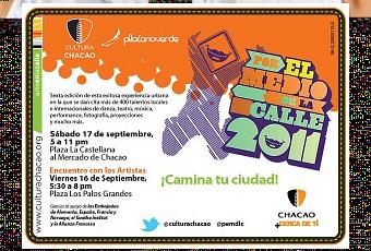 El próximo sábado 17 de septiembre a partir de las 5:00 de la tarde, la Alcaldía de Chacao, Cultura Chacao y la Fundación Plátanoverde llevarán a cabo la Sexta Edición del Festival Por el medio de la calle, con la exhibición simultánea en distintos espacios públicos del Municipio Chacao, de más de 160 propuestas artísticas nacionales, y 4 invitados internacionales provenientes de Francia, España, Noruega y Alemania.