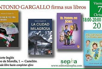 El próximo viernes 7 de octubre estaré firmando ejemplares de mis cuatro novelas en El Corte Inglés de Castellón: -Moviola de tres vidas truncadas -La Ciudad Milagrosa -El poder de Joel -Pelopincho y la puerta mágica Mención especial merece mi última novela: "Pelopincho y la puerta mágica", la cual podréis conocer en primicia el día de la firma.
