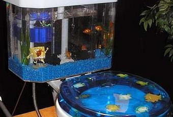 Es un inodoro Fishn Flush que presenta un propuesta de un pequeño acuario dentro de tu inodoro, mas especifico en el tanque de tu inodoro, en el cual puedes colocar coloridos peces. Los peces se encuentran aislados del flujo de la cisterna y no se pasaran al jalar la cadena, así que nada malo le pasará a los peces. A continuación unas fotos con tan novedoso diseño de inodoro :