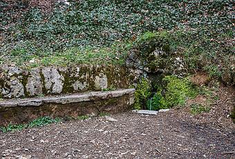 Una modesta fuente en un rincón rodeado de robles donde precisamente falta el árbol que le da nombre, un aliso o "vern".