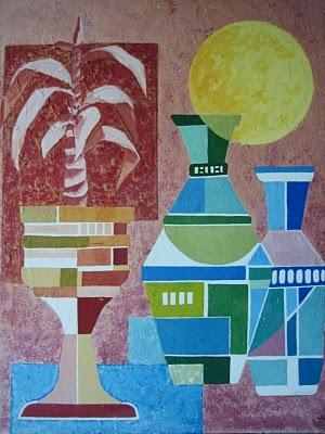 Pintura al TempleDecía Cézanne que todas las Formas de la Naturaleza eran susceptibles de ser representadas por las figuras básicas de la Geometría: triángulo, cuadrado, circunferencia, etc.Algo de ésto me he propuesto experimentar con este trabajo donde los motivos representados vemos que tienen una resolución geométrica que, por otra parte, armoniza todo el conjunto.Los planos diferenciados de color, además de desarrollar una gran riqueza cromática, sirven para diferenciar los objetos y crear una cierta sensación de volumen.