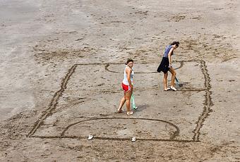 La imagen esta tomada en la playa -una del centro- en un día soleado, dos chicas armando una cancha y dispuestas a jugar mano a mano su deporte favorito. Una instantánea, una pequeñísima parte de sus vidas que queda congelada y perdurará, espero, para siempre. Magia de la fotografía.