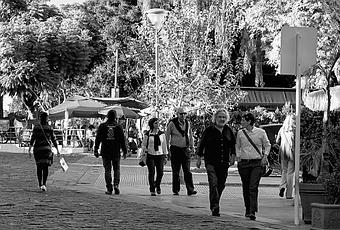 La calle empedrada como demarcando a los turistas que se encontraban paseando. El lugar a media sombra contrasta con el fondo plenamente iluminado.