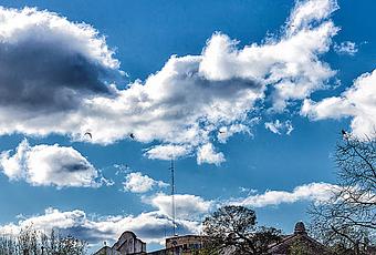 El espectáculo lo marcan ese cielo con esas grandes nubes y aparecen palomas en vuelo como acompañándolas. Abajo la ciudad los observa.