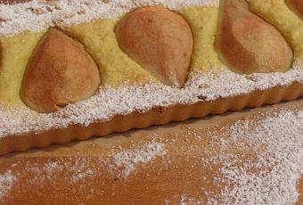 Comenzamos por la masa quebrada, cogemos un bol y añadimos la mantequilla muy fría en daditos. Añadimos la harina, el azúcar, las almendras, la pizca de sal y con la mano bien limpia vamos mezclando sin amasar demasiado, solo que se integren bien los ingredientes. Este punto estará listo cuando queden como migas de pan, añadimos el huevo batido en este momento y un chorrito muy pequeñito de amaretto. Volver a mezclar los ingredientes y formar una bola, salvo si pega en las manos, en este caso añadir un pelin mas de harina. Introducir en la nevera de 30-40 minutos envuelta en film. Pasado este tiempo precalentamos el horno a 180ºC, estiramos la masa en una superficie enharinada y la colocamos sobre el molde. Recomendamos uno alargado como el de la foto y desmontable. Cortamos los sobrante y damos forma a los bordes con el mango redondo de una cuchara de madera. En este caso no se hornea previamente la masa. Para la crema, cogemos un bol y añadimos mantequilla a punto pomada, el azúcar, la almendra, la harina, el huevo y el amaretto. Con una cuchara de madera mezclamos todo hasta que nos quede como una crema. Incorporamos sobre la masa y extendemos con ayuda de una espátula haciendo que llegue a todas las esquinas. Pelamos las peras, las abrimos por la mitad y las descorazonamos. Colocamos las mitades de la peras alternando la posición como se ve en la imagen, presionamos la pera para que se hunda un poco en la crema. Hornear 40-45 minutos a 180ºC retirar y una vez fría decorar con azúcar glass.