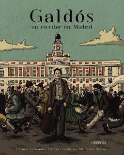Carmen Fernández Etreros es la autora del texto escrito que se muestra de manera ágil, como sucede en la tipología propia del cómic. Galdós es el protagonista absoluto del relato. Se recuerda su llegada a Madrid, con solo 18 años. Galdós viajó desde Las Palmas para estudiar en Madrid, sí, pero, sobre todo porque su familia quería alejarlo del amor a su prima Sisita. Desde el pasado, cuando Galdós es ya un anciano, que ha perdido la vista y que es homenajeado, se recuerda su peripecia vital. Su llegada a Madrid, su afición a perderse por las calles, su curiosidad innata, la relación que mantuvo con las distintas mujeres que pasaron por su vida, aunque nunca se casó con ninguna y las dificultades que tuvo para abrirse camino en el mundo de la narrativa. Galdós viajó a París, con su familia, y allí descubrió a Balzac quien cambiaría su manera de entender la literatura. Todo eso, Carmen Fernández lo recoge, gracias a una exhaustiva documentación, de manera certera y muy directa. Galdós tuvo mucho que agradecer a su cuñada, que siempre creyó en él y le ayudó económicamente y a su hermana. Destaca también su hija María, a la que acabó reconociendo. No es de extrañar que sea la figura femenina quien se muestre como protagonista enorme en sus textos. Desde "La Fontana de Oro" a los "Episodios Nacionales", pasando por "Doña Perfecta" y "Fortunata y Jacinta", muchos son los grandes títulos que se mencionan en la novela de los que, incluso, se reproduce un fragmento, aunque muy bien integrado en la historia. Galdós se ganó la vida como periodista, aunque siempre con apuros, quiso fundar editorial propia y lo hizo, pero no le funcionó y mantuvo una relación compleja con Emilia Pardo Bazán. Destacan los momentos históricos que vivió en la capital de España, de los que Galdós fue testigo de excepción. El entierro de don Benito fue multitudinario y una muestra de afecto popular.