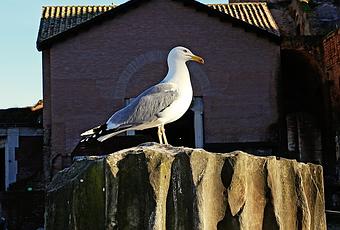 Una gaviota se posa y posa sobre los restos de una columna en el foro romano de Roma, Italia.