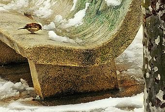 Dos gorriones sobre el banco de piedra de un parque nevado
