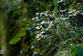La luz atrapada en las gotas de rocío en la vegetación del muro del viejo puente. --- Arantza, Nafarroa. [EXIF]