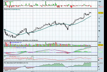 Tal y como está el mercado español es muy arriesgado entrar largos en cualquier valor, pero en estos momentos Grifols que se mantiene con una fortaleza envidiable, que tiene una mm de 30 sesiones muy alcista y un precio que cotiza por encima de la misma no solo ha dado una señal para tomar parte en el valor si no que también al haber atravesado la resistencia de los 19€ ha entrado en un nuevo terreno en el que no tenemos obstáculos de ningún tipo, se trata de la subida libre.Un vez más, aunque nos ha dado señal de entrada, como el precio está muy alejado de la mm de 30 sesiones entonces el stoploss que deberíamos colocar nos supondría un riesgo de un 14,5%. A lo mejor en otras circunstancias, es decir, mercado global alcista, sector alcista.... se podría arriesgar, pero en la situación que vivimos, un Ibex 35 a la baja, conlleva un gran riesgo.