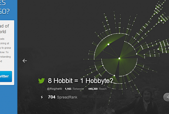 Después de eso, se vuelve como un grado de separación de juego, con los anillos más grandes que muestran retweets de personas distintas de los seguidores originales. También hay pequeñas líneas verdes que vienen de la gráfica que muestran la cantidad de seguidores que cada usuario tiene Twitter.