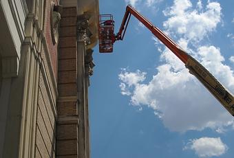 Con grúa y mucha seguridad – aunque me extrañó que no acordonaran el área, impidiendo el paso peatonal por la zona, aprovecharon el buen tiempo de finales de mayo para darle mantenimiento a la venerable fachada.
