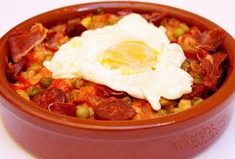 9.Vamos a montar el plato, si tienes unas cazuelitas de cerámica (fíjate en la foto) mejor que mejor y si no en un plato. Reparte las patatas entre los dos platos, luego añade por encima la salsa de tomate con el chorizo, los guisantes y el jamón y por último coloca un huevo arriba del todo. Fuera de la cocina y no te olvides del pan!! Fuente: javirecetas